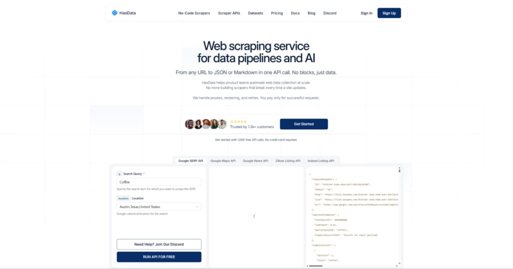 HasData takes an AI-first approach to web scraping with the HasData Web Scraping API. The service focuses on LLM pipelines and structured data rather than raw HTML. You don’t get messy markup back. You get clean JSON or Markdown ready for ingestion. This removes a ton of parsing work from your backend team. The infrastructure is managed and scales automatically. No manual proxy tweaking. No browser automation scripts to debug.