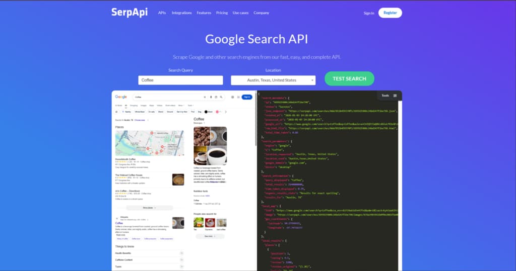 If you need to monitor search rankings or track product prices across marketplaces, SerpApi is the obvious choice. The service maintains parsers for dozens of search engines. You just send a query and get clean JSON back. It’s reliable and built for real-time data retrieval.