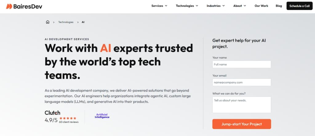 BairesDev is an AI development company backed by over 4,000 engineers, trusted by CTOs at more than 1,500 companies, including Google, Pinterest, and Microsoft. The company delivers AI-powered solutions that go beyond experimentation, helping organizations integrate agentic AI, custom large language models, and generative AI into their products.